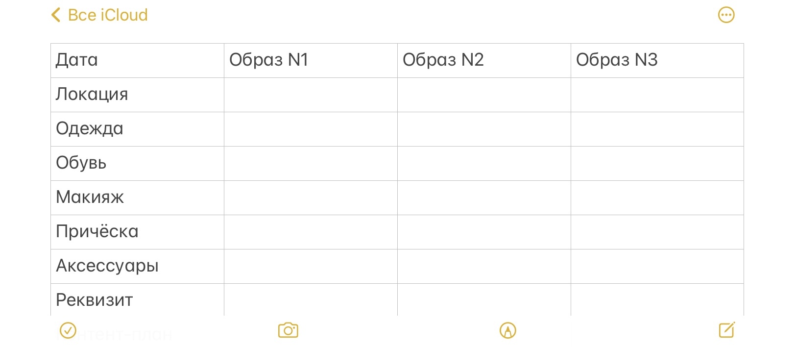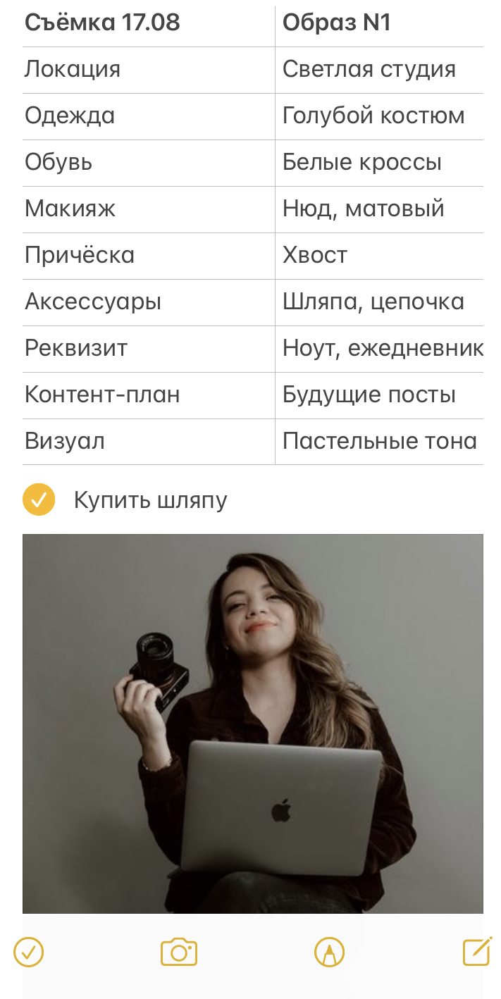 Каждая моя съёмка начинается вот с такой таблицы. Можно сделать то же самое на бумаге и потом перенести в электронный формат. Я пишу прямо в заметках на айфоне. Очень удобно - можно в эту же заметку вставить фото с идеями и список с отметками